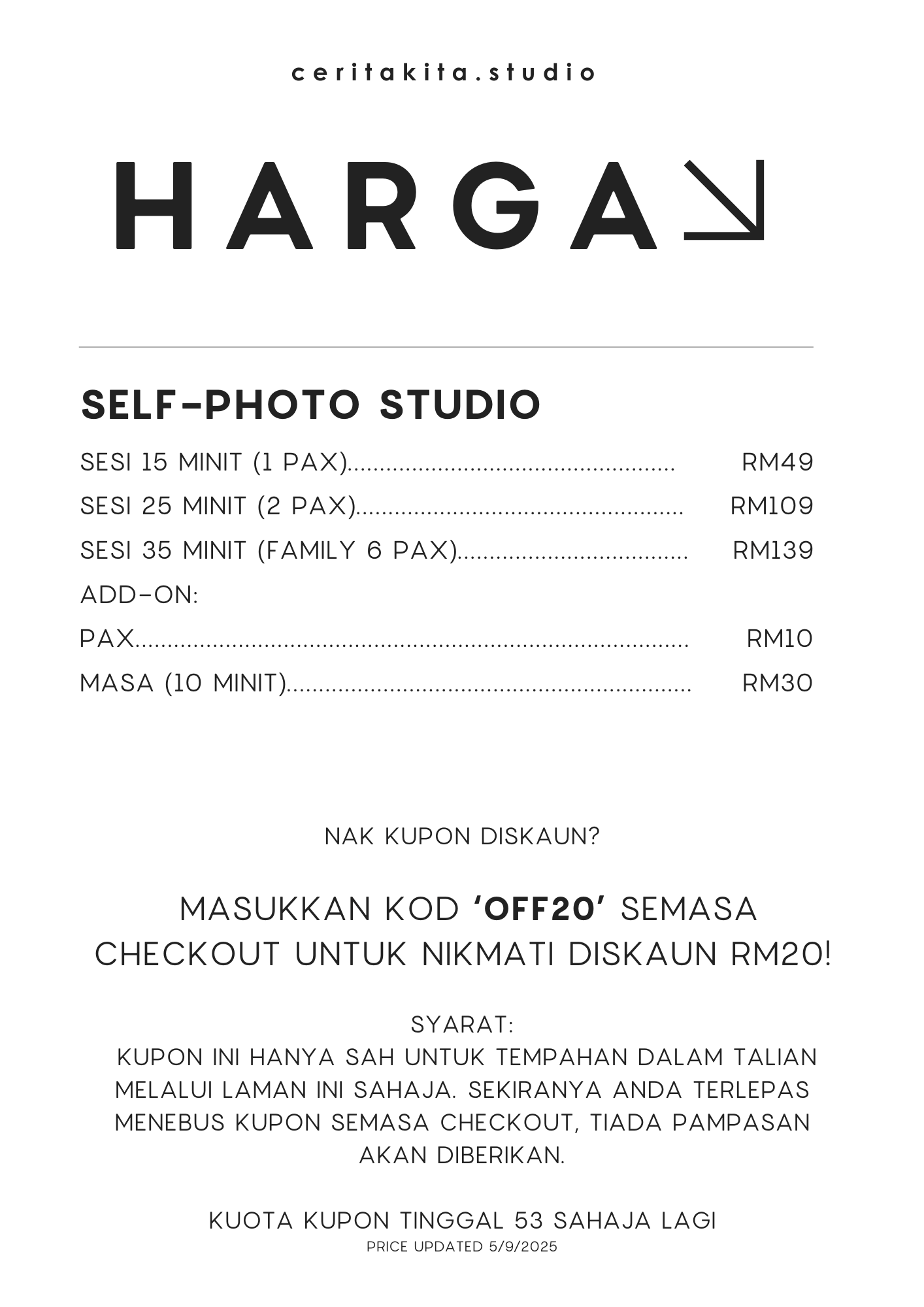 Tangkap detik berharga bayi baru lahir anda dalam suasana santai dan selesa. Dengan pencahayaan lembut dan props comel, kenangan indah ini akan menjadi harta yang tak ternilai sepanjang hidup.